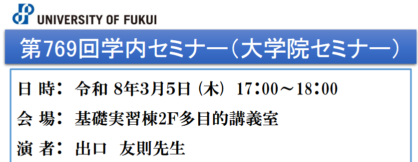産業技術総合研究所の出口友則先生が共同研究のために来学し、大学院セミナーを行ってくれました。本学の神経科学分野の深澤教授との共通点が多いことを知って驚きました。