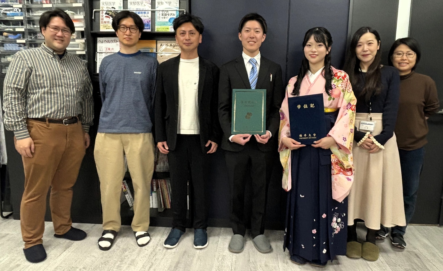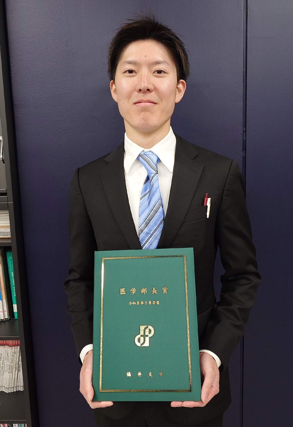 私たちのラボで研究活動を行っていた医学科の石田凌三さんと看護学科の山本愛花さんが卒業を迎えました。石田凌三さんは研究業績が認められ、令和7年度福井大学医学部長表彰を受賞しました。研究室での日々を通じて大きく成長されたお二人の今後のご活躍を心よりお祈り申し上げます。おめでとうございます!